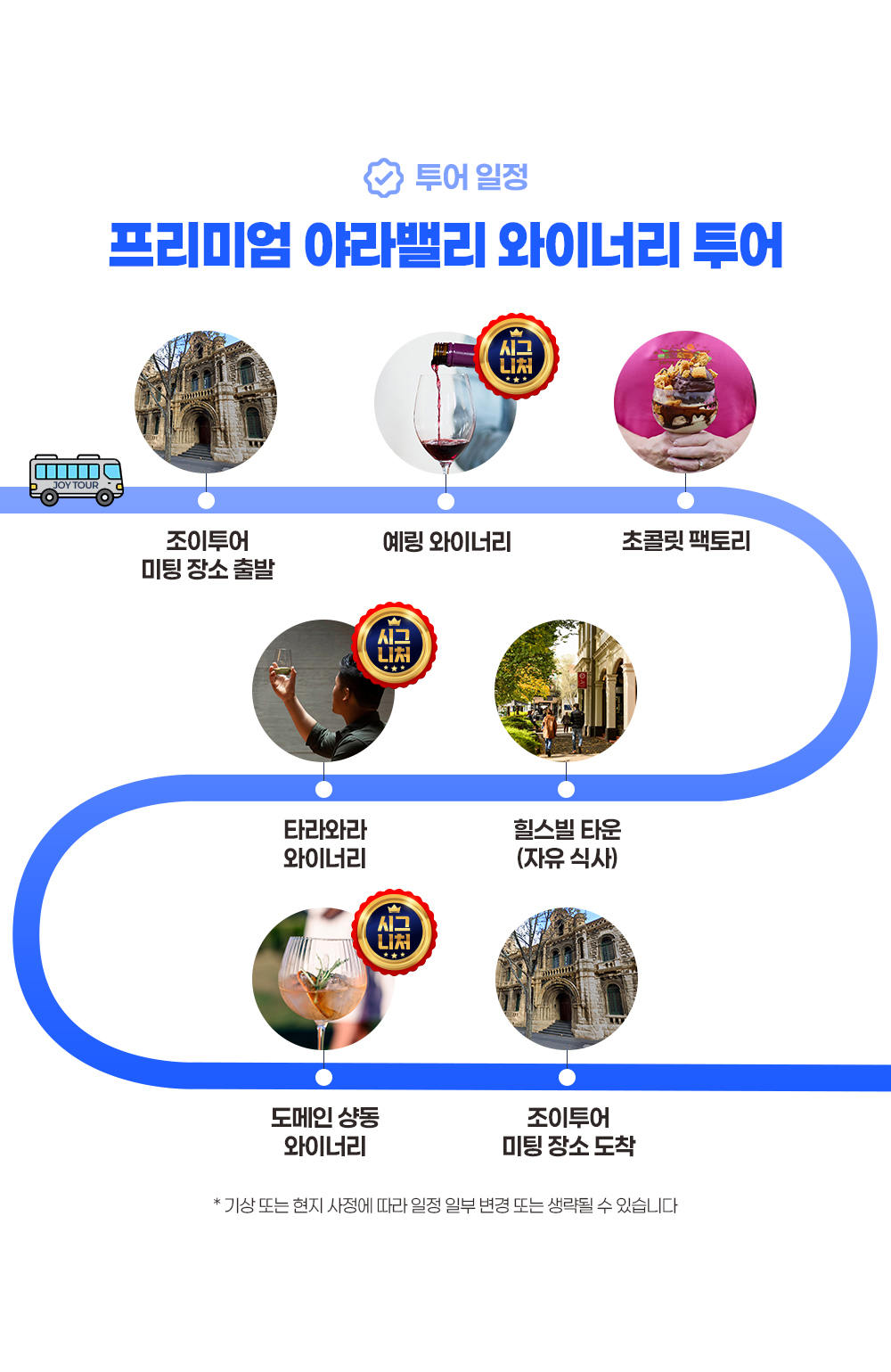 - 기상·도로통제·현지 사정에 따라 일부 일정 변경·제외 또는 투어 시간이 변경될 수 있으며, 이로 인한 환불·보상은 불가합니다.