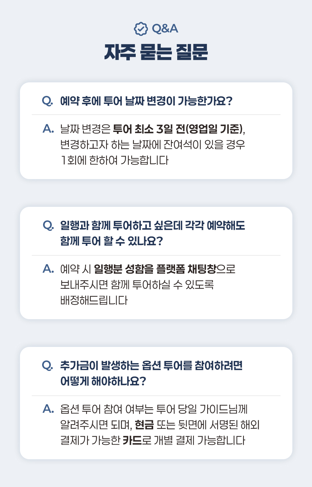 - 날짜 변경은 투어일 최소 10일 전(영업일 기준)까지 요청 가능하며, 잔여석이 있을 경우 1회에 한해 변경이 허용됩니다. 이후 재변경 및 취소·환불은 불가합니다.