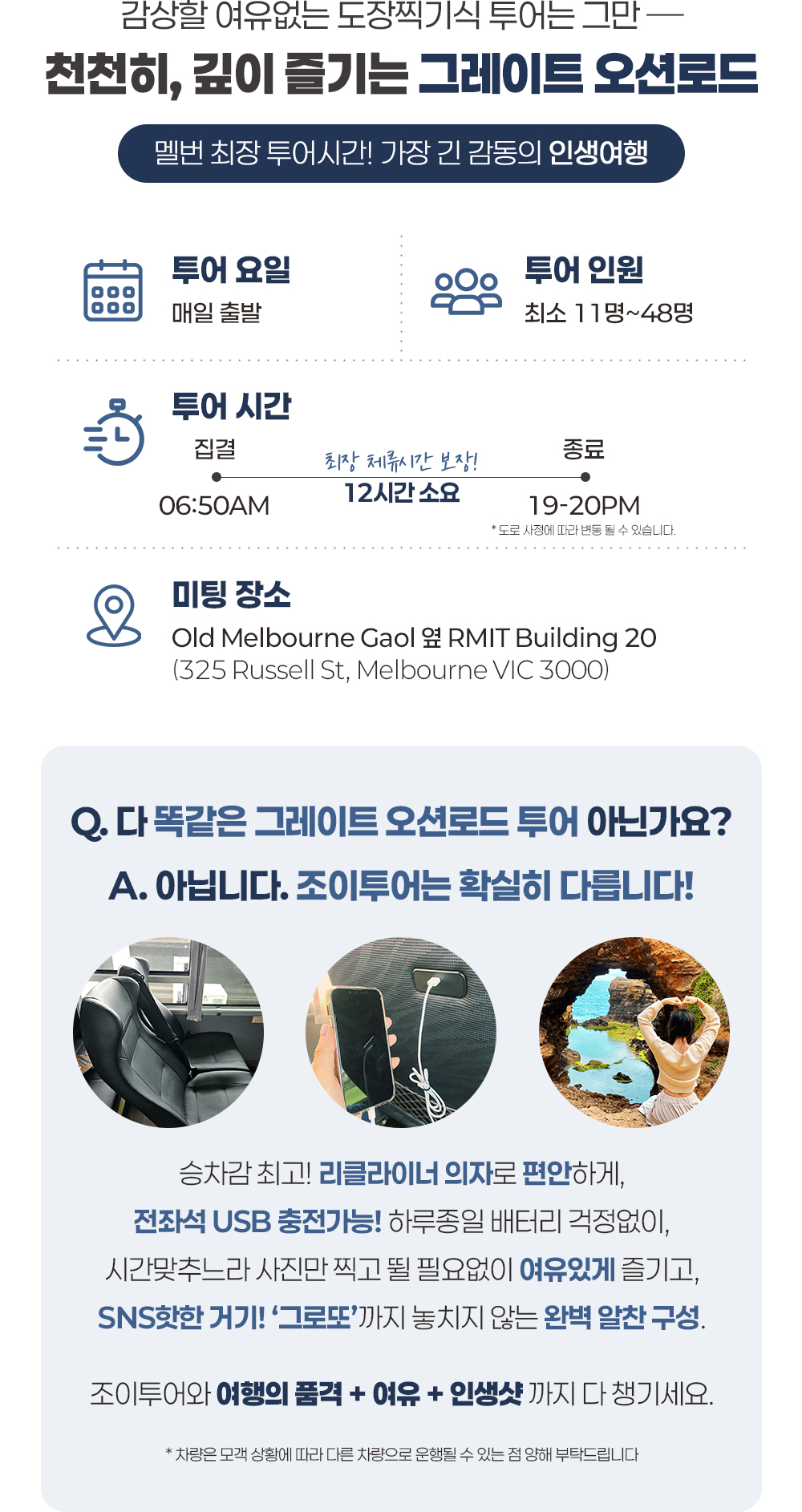 12사도, 로크아드협곡, 런던브리지 등 핵심 명소는 물론, 조이투어가 발굴한 SNS 인생샷 명소 ‘그로또' 도 방문합니다.