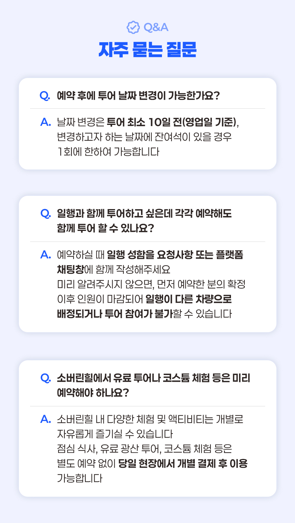 - 투어 차량은 모객 상황에 따라 달라질 수 있으며, 예약 순으로 배정됩니다.